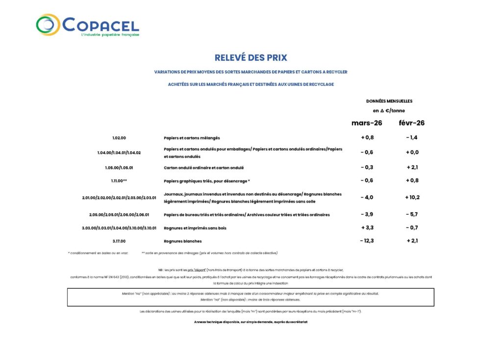 N. B. : Le processus de traitement des prix des papiers et cartons à recycler est vérifié par le cabinet indépendant PwC. COPACEL tient à la disposition des tiers l’attestation de PwC portant sur l’année 2020.